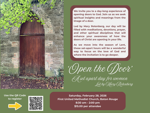 You are invited to a daylong retreat, “Open the Door,” to seek spiritual disciplines that enhance your awareness of how the doors of Christ are opening in your life. As we approach the season of Lent, this day will focus your faith journey. Registration is $15. Led by Mary Rotenberg.