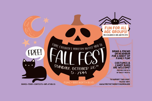 Preparations are underway for Fall Fest and churchwide support is needed to make this event a success! Sign up to help at the event, provide items for the Cake Walk, become an event sponsor, or make a donation. Collection bins for donated candy and small trinkets are near the Conference Center Welcome Desk and the church office.